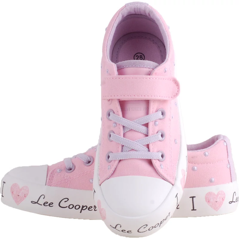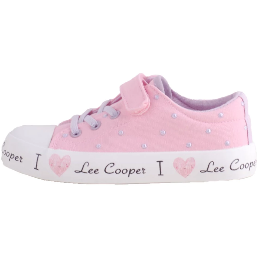 Rózsaszín-halványlila, pöttyös, gumifűzős-tépőzáras, hajlékony talpú, Lee Cooper lányka vászoncipő. Kényelmes, divatos cipő, szuper választás nyárra vagy benti/ovis/sulis használatra.